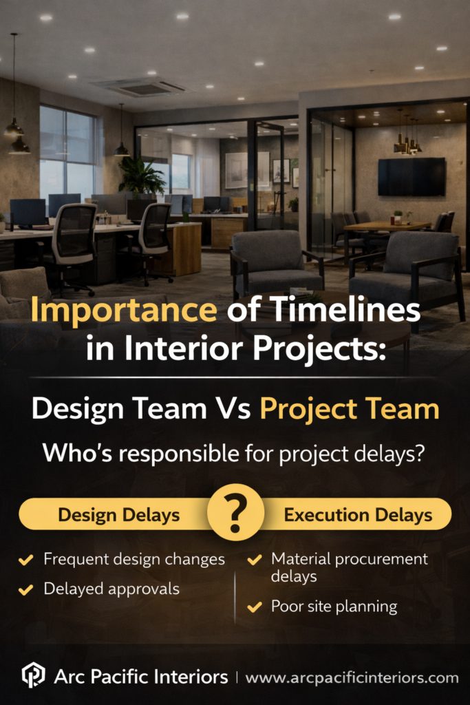 Arc Pacific Interiors follows clear timelines, milestone-based planning, design freeze policies, and daily site supervision to deliver tension-free office interiors on time, within budget, and with quality assurance.